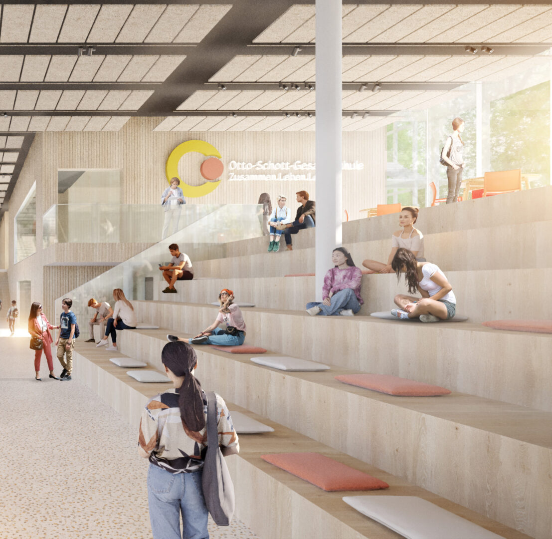 Der Entwurf für die neue Otto-Schott-Gesamtschule in Witten basiert auf einem innovativen Cluster-Konzept, das die Funktionen einer Jahrgangsstufe räumlich bündelt. Die Schule besteht aus vier Gebäudekörpern auf einer gemeinsamen, zweigeschossigen Basis. Drei Baukörper sind zum Schulhof ausgerichtet, der vierte, höchste Baukörper dreht sich zur Straße „Am Viehmarkt“. Die zweigeschossige Basis beherbergt zentrale Funktionen und ist eng mit dem Schulhof verbunden. Eine öffentliche Fuß- und Radwegverbindung wird integriert, während Niederschlagswasser in Versickerungsmulden gesammelt wird.