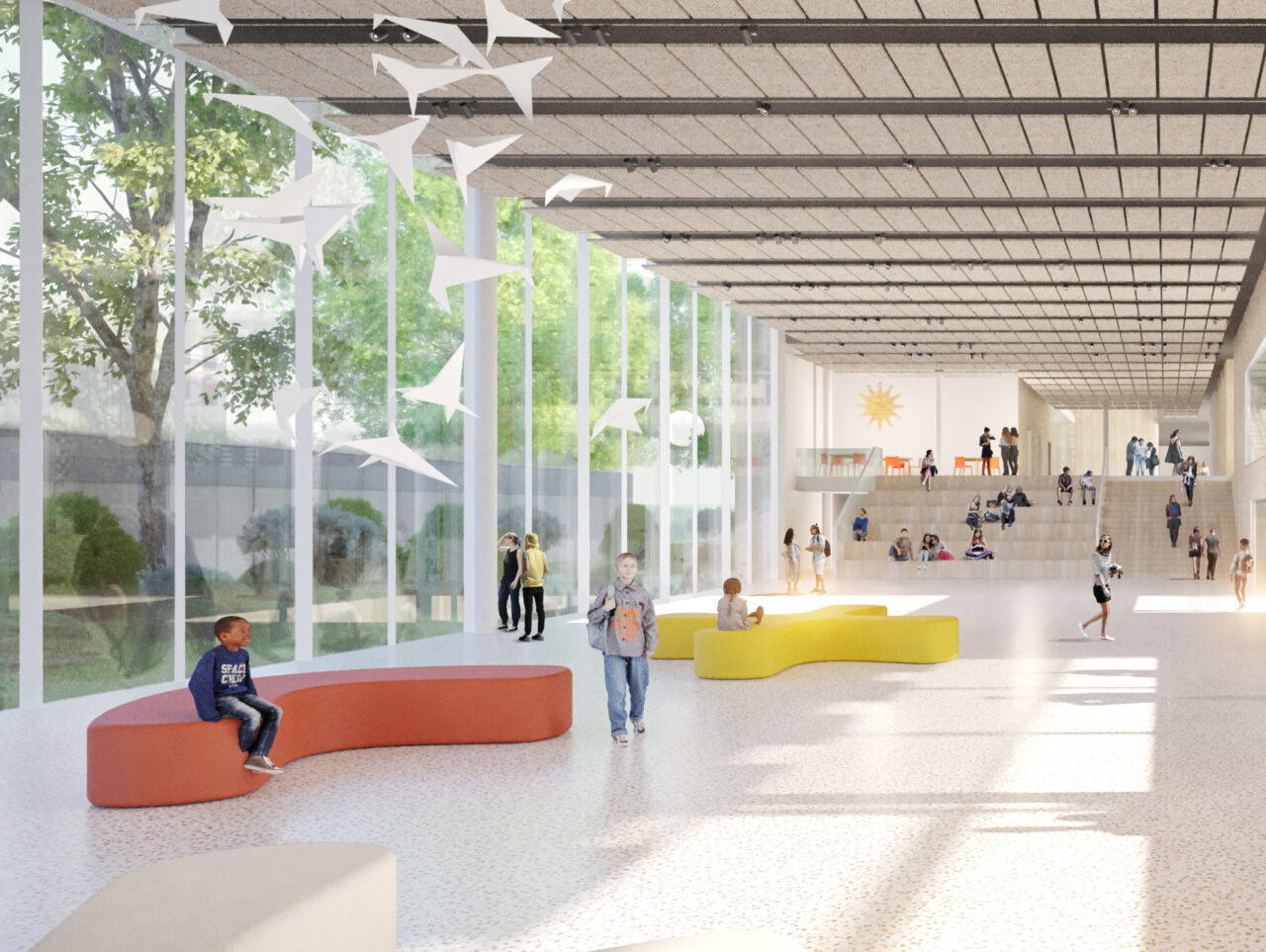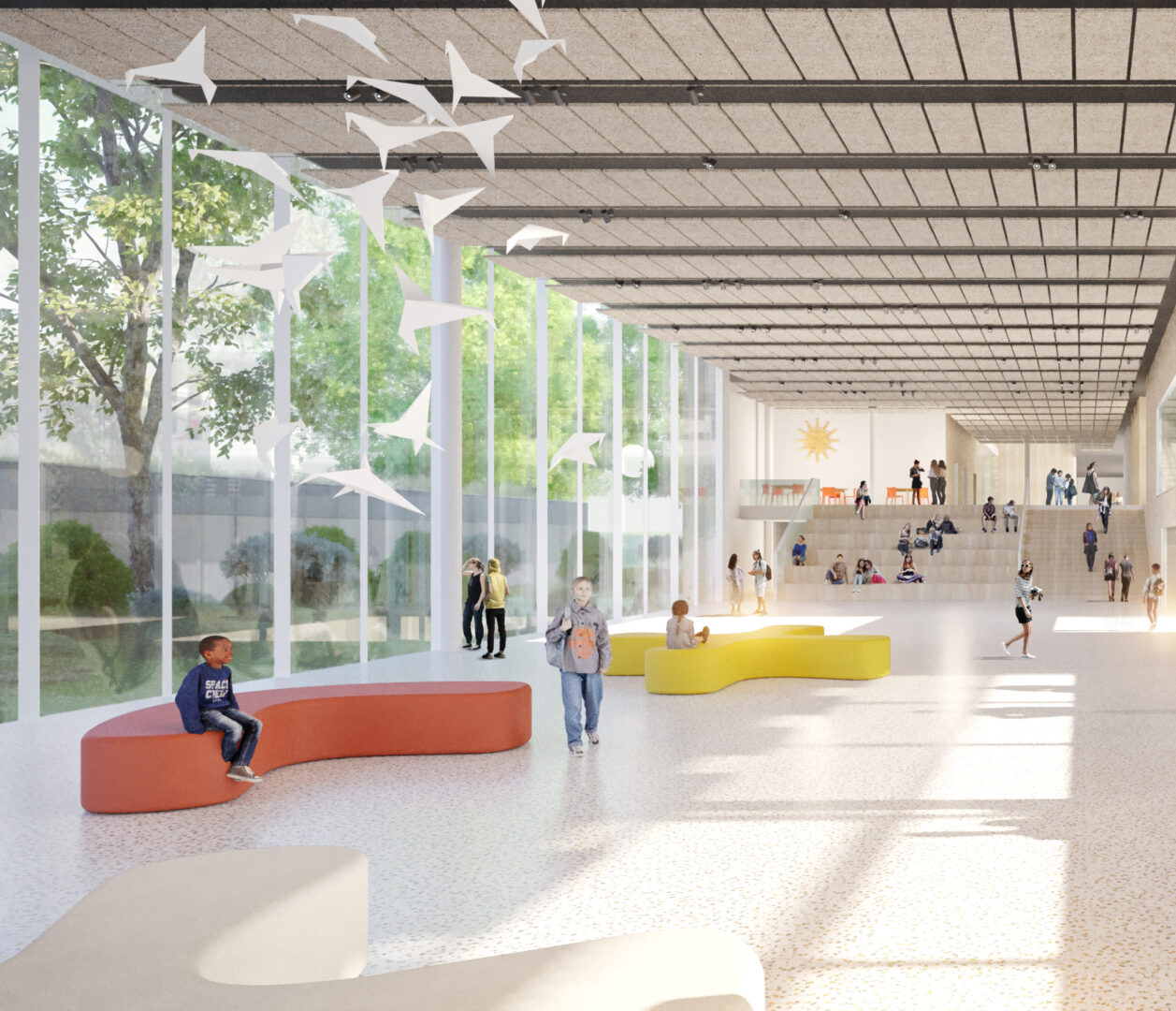 Die Freiraumgestaltung entspricht den Anforderungen des Klimafolgeanpassungs- konzepts. Ein hoher Anteil der Bestandsbäume bleibt erhalten, darunter ein markanter Silberahorn, der als zentrales Gestaltungs- element dient. Der Schulhof ist in Bereiche für Bewegung und Rückzug unterteilt. Materialien wie Beton- und Natursteinquader werden für Sitzmauern und Kletterstufen verwendet. Der Vorplatz am Haupteingang ermöglicht informelle Zugänge und der Parkplatz ist funktional gestaltet. Insgesamt entsteht ein nachhaltiger Lernort, der Arten- und Klimaschutz fördert und ein ansprechendes Umfeld für Lehrer und Schüler bietet.